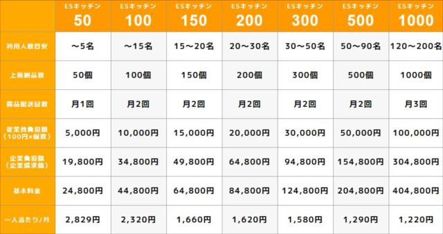 食事関連の福利厚生は「従業員のあってよかった福利厚生」として満足度の高く需要度の高いものです。莫大なコストをかけられないけれど食事の福利厚生を充実させたい企業におすすめしたいのが100円社食のESキッチンです。従業員は好きなパウチ惣菜を電子レンジであたためるだけ、と手軽に利用できる人気のサービスです。栄養バランスの良い食事を安く提供する事で、健康への配慮、経済的サポートにも繋がります。企業側が用意するのは電子レンジ、また冷蔵庫を設置するスペースのみです。事業規模の大小に関わらず利用でき、全国対応可能なため100円社食のESキッチンを導入する企業が増えています。最近ではコロナ禍の影響で外に出なくても社内でランチが済ませられるといったメリットもあります。導入コストは下記の表をご覧ください。